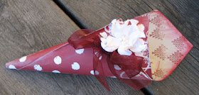 Den stora pappersblomman har jag gjort, man gör ungefär som när man gör blommor av pappersnäsdukar. Om man skrynklar pappret ordentligt innan man börjas så blir det följsamt och lätta att arbeta med, säkert funkar det även att blöta lite.
