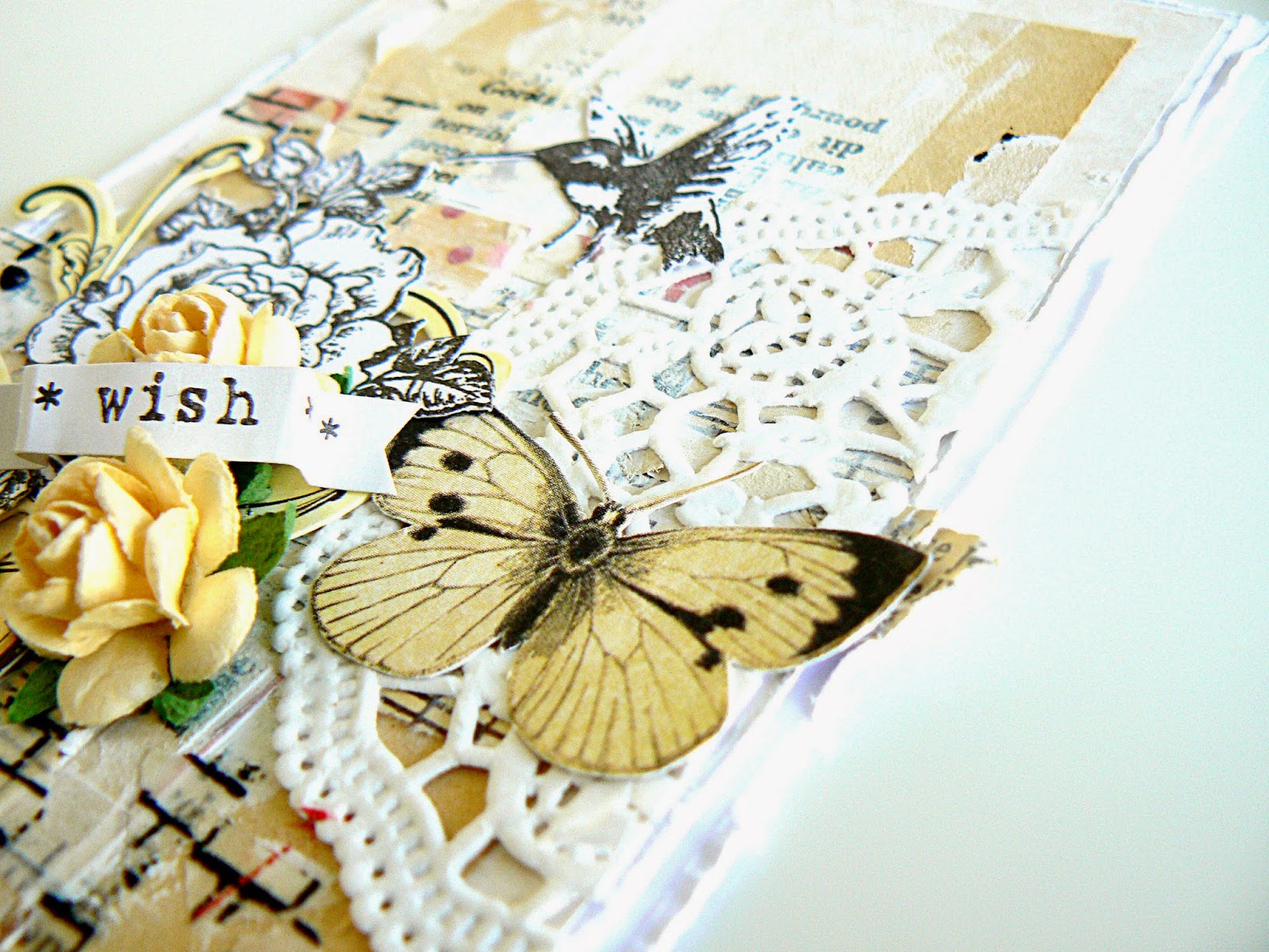 I used a stamp, flower + from  bird Papercraftscandinavia that I stamped in black, I cut out the floral pattern, and the bird, and I stuck them on  my card separately. This white background created a nice contrast with old paper, and it also adds a lot of sweetness, like this piece of small doily that I stuck on the edge of my card.